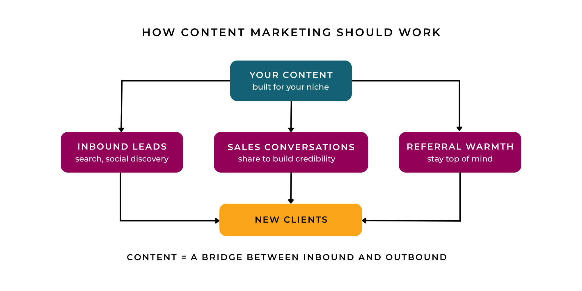A good content strategy isn’t a quick win. It takes a lot of time and effort to get it right. But when you do get it right — starting with a defined audience, meeting them on the right platforms, and using your content in every part of your business development — the results compound in ways that referrals alone never can.